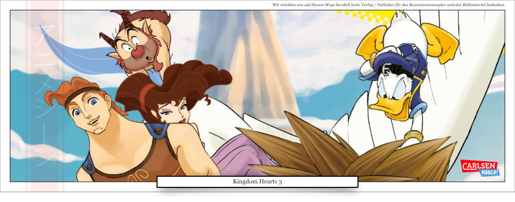 Der Manga-Serie „Kingdom Hearts 3“ basiert wieder auf dem gleichnamigen Spiel und wurde wieder von Shiro Amano gezeichnet. Erschienen ist diese Manga-Serie auch bei „CARLSEN“ und fällt erneut in den Bereich Action.