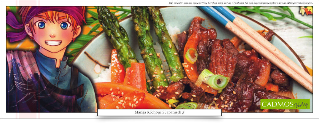 Nach all den Mangas und Animes in den vergangenen Monaten hatte ich einfach mal wieder Lust etwas anderes zu lesen und so habe ich mich bei den Verlagen auf die Suche nach neuen Material gemacht. Bei meiner Recherche ist mir aufgefallen, dass die Autorin »Angelina Paustian«, die ich auf Veranstaltungen persönlich kennenlernen durfte, ein neues Manga – Kochbuch auf dem Markt gebracht hat, mit dem Titel »Manga Kochbuch Japanisch 3«. Dieser dritte Teil ist erneut beim »Cadmos Verlag« erschienen. Für den Fall, dass jemand über den Begriff »Japanisch« stolpert, das Kochbuch ist selbstverständlich in deutscher Sprache. ![]()