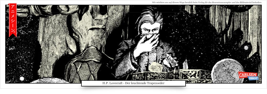 Wenn ich daran denke, dass ich vor einigen Monaten nichts mit den Werken von „H.P. Lovecraft“ zu tun haben wollte, dann frage ich mich heute eigentlich warum. Dank des Mangaka „Gou Tanabe“ und seinen gelungenen Adaptionen von „H.P. Lovecraft“-Meisterwerken bin ich nun richtig süchtig. Das Werk meiner Begierde war „Der leuchtende Trapezoeder“, welches bei „CARLSEN“ im Programm ist. Enthalten sind zwei schaurig schöne Geschichten, die so richtig an die Nieren gehen.
