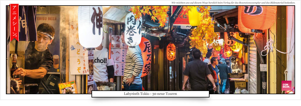 Mit „Labyrinth Tokio - 30 neue Touren“ hat der „CONBOOK“ Verlag einen tollen Reiseführer in seinem Programm, der viel mehr Mehrwert bietet als die normalen Reiseführer, die sich nur mit den bekannten Sehenswürdigkeit auseinander setzen. Der aufwändige Druck auf dickem Hochglanzpapier und das zu einem lächerlichen Preis von 12,95 € runden das Gesamtpaket ab.