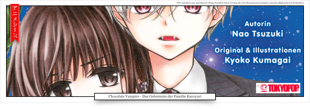 Dies ist die Ausgangsgeschichte der Mangareihe “Chocolate Vampire” von Kyoko Kumagai, die mittlerweile jedem Shojomanga-interessierten Leser bekannt sein sollte. Nao Tsuzuki schrieb dazu die Light Novel “Chocolate Vampire - Das Geheimnis der Familie Kuroyuri”, welche bei „TOKYOPOP“ im Vertrieb ist.