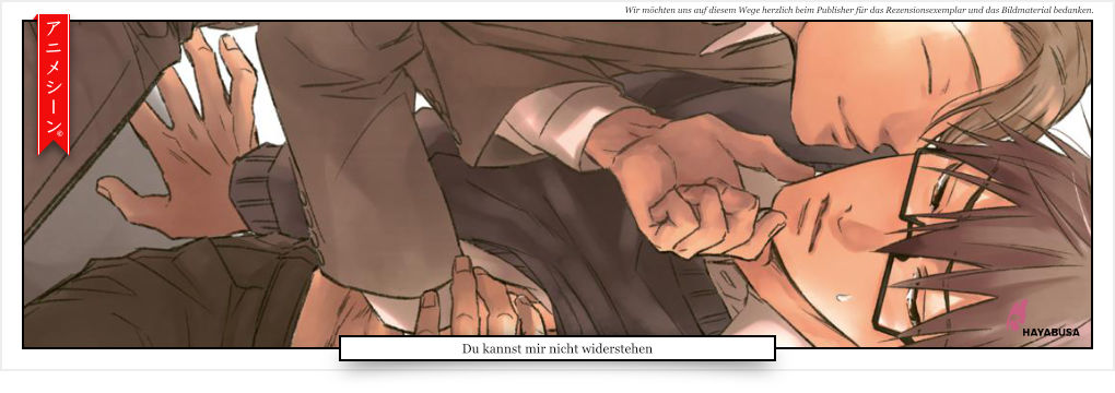 “Du kannst mir nicht widerstehen” ist eine interessante Geschichte zwischen zwei widersprüchlichen Protagonisten. Während Mikajima in der Arbeit viel intim mit Männern zu tun und dadurch zwangsläufig reichlich Erfahrung hat, ist Nitta eigentlich gar nicht der Typ für so etwas. Aber da er sich an sich gut mit dem Scout versteht, kann er sich von ihm auch nicht ganz losreißen, was Mikajima wiederum zu nutzen weiß und ihn zu vielem überredet oder zwingt, was wiederum Nitta dann doch nicht aus dem Kopf geht.