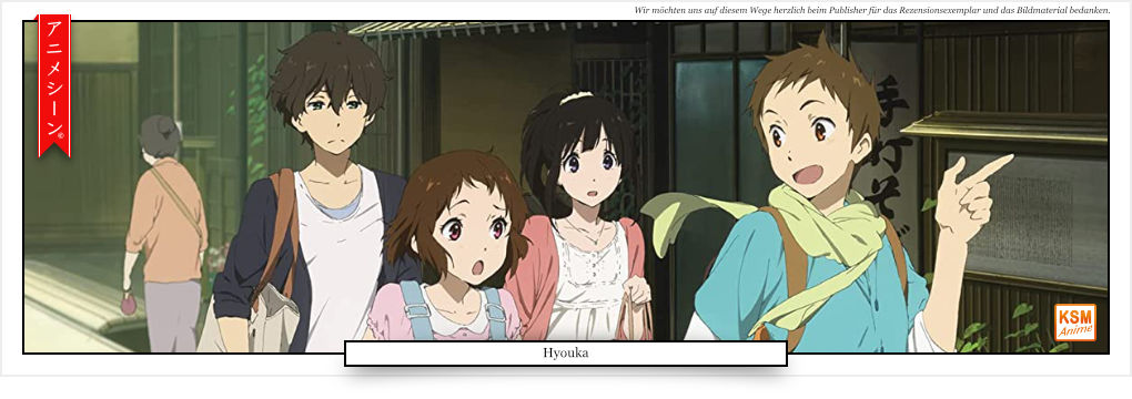 Spätestens seit Werken wie "Violet Evergarden" und "A Silent Voice" bin ich ein großer Fan der Arbeiten des Kyoto Animationsstudios. Ein Titel vom Genre Mystery/Krimi ist mir aus ihrem Hause allerdings noch nicht bekannt. Umso gespannter bin ich, was der Anime "Hyouka" aus dem Sortiment von "Koch Films" zu bieten hat.