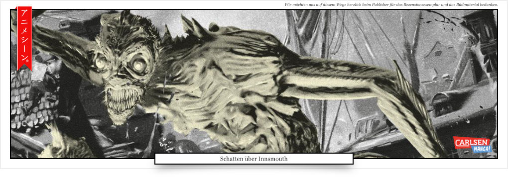Fan von H.P. Lovecraft? Nun denn, in dieser Review geht es um die Manga-Adaption „Schatten über Innsmouth“ von Gau Tanabe, welche 1931 fertiggestellt und 1936 zum ersten Mal veröffentlicht wurde. Das war noch zu Lebzeiten von H.P. Lovecraft, was diese Geschichte zu etwas besonderen macht. Erschienen ist diese 448 Seiten schaurige Schwarte bei „CARLSEN“