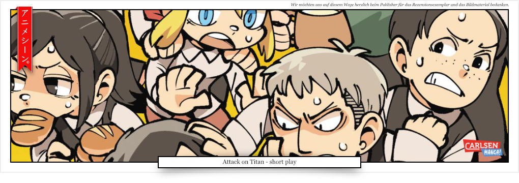 Freunde des überspitzten Humors kommen bei „Attack on Titan - short play“ voll auf ihre Kosten. Die Tatsache, dass „Attack on Titan“ im Grunde eine sehr ernste Story ist, stört am Anfang ein wenig. Man muss sich erst einmal an die Bissigkeit gewöhnen. Haben sich dann die Synapsen im Gehirn neu sortiert, sind Lacher garantiert.