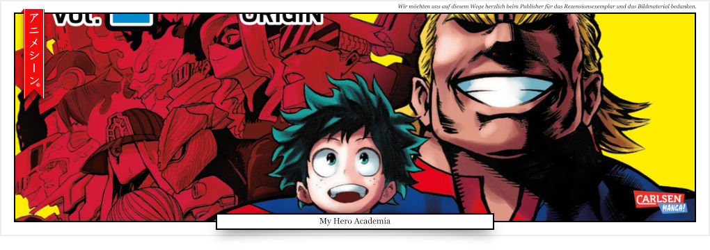 In dieser Rezension geht es um die Manga-Serie „My Hero Academia“, welche bei „CARLSEN“ seid 2016 im Vertrieb ist. Eine Serie, die vom Autor/Zeichner umgesetzt wurde, weil er einfach Lust drauf hatte und mal was für sich tun wollte. Mit dem Ergebnis kann er durchaus zufrieden sein.
