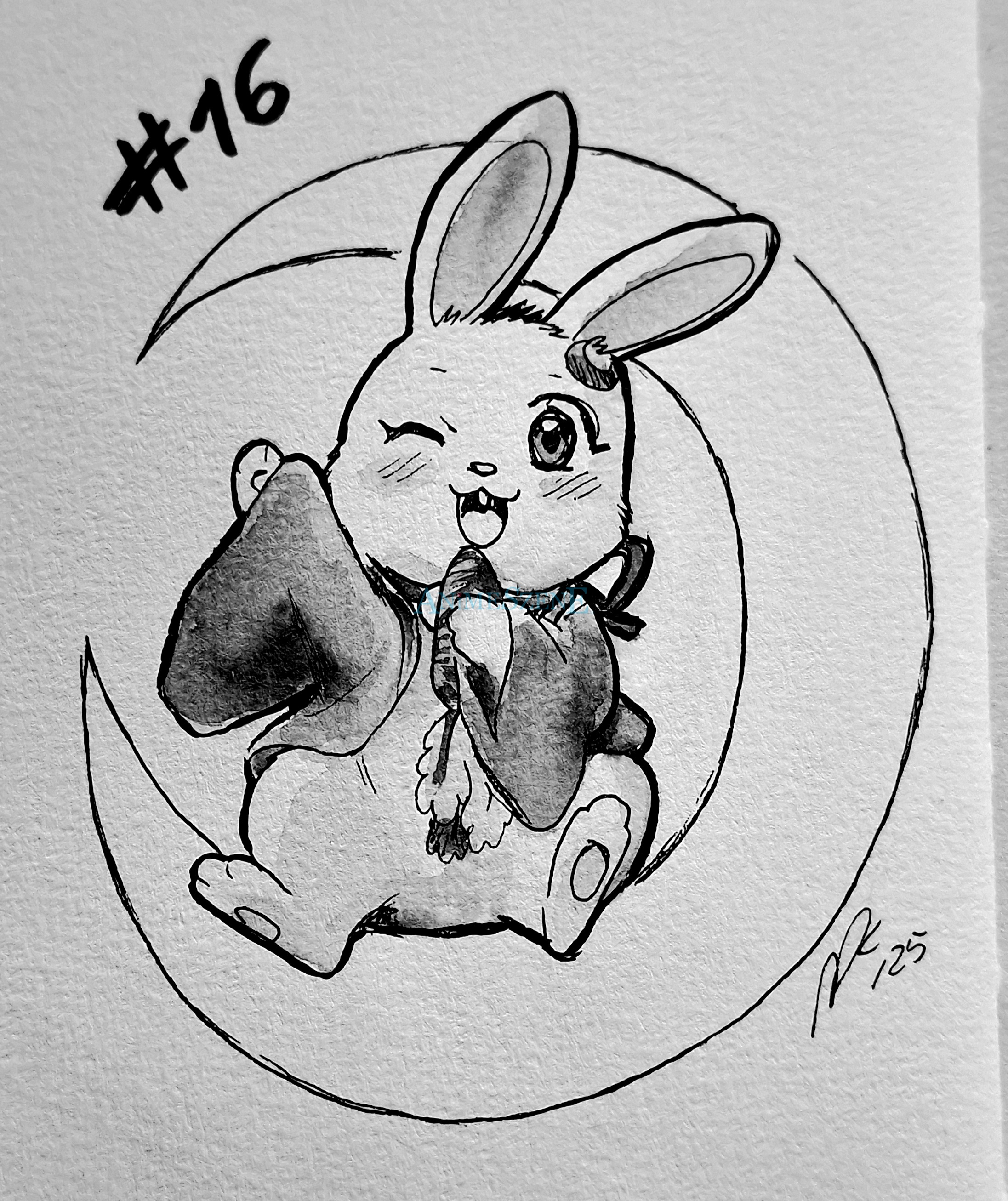 #inktober2025 #moon #cuteanimal #kawaii #bunny #eigenercharakter #legacyofsun #lilika #aquarell #schwarzweiss