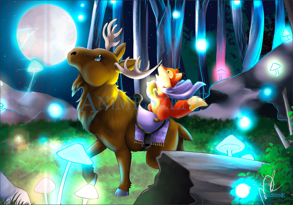 His chosen motif was both touching and imaginative: a small fox riding on an elk, the two gazing together at a clear, star-filled sky. The scene was to be rendered in a childlike style, with special design elements that convey warmth and comfort.